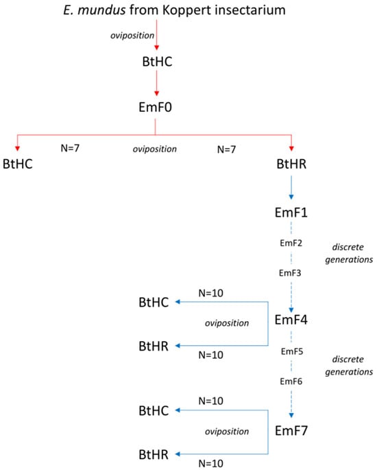 Eretmocerus mundus individuals were first obtained in 2014 from Koppert Biological Systems, S.L. (Águilas, Murcia, Spain). The parasitoids were mass-reared in Koppert’s insectarium on a strain of B. tabaci MED Q1 infected by Hamiltonella and Cardinium. Before starting the bioassays, we reared the Koppert strain of E. mundus on BtHC for one generation. Subsequently, a colony of the parasitoid was established on BtHR, starting from individuals obtained from BtHC (Figure 1).