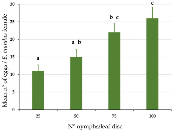Mean number of eggs laid by Eretmocerus mundus females at different densities of Bemisia tabaci nymphs of the BtHC strain. Bars indicate standard error. Means bearing different letters are significantly different after Tukey’s HSD post hoc test at the 95% confidence level (25 vs. 75 nymphs p = 0.024; 25 vs. 100 nymphs p = 0.001; 50 vs. 100 nymphs p = 0.017).