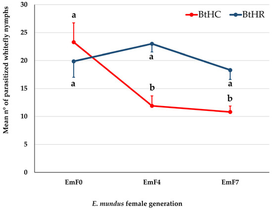 Mean number of dead nymphs of Bemisia tabaci of strains BtHC or BtHR observed in experimental arenas treated with Eretmocerus mundus females of the parental (EmF0), fourth (EmF4), or seventh (EmF7) generation. For the BtHC strain, different red lowercase letters indicate significantly different means after a GLM analysis followed by Fisher’s LSD post hoc test with Bonferroni correction (adjusted p-values in the text). For the BtHR strain, means do not differ significantly between the three generations of E. mundus (identical blue lowercase letters). Means do not differ significantly in pairwise comparisons between the two strains (identical black capital letters). Bars indicate standard error.