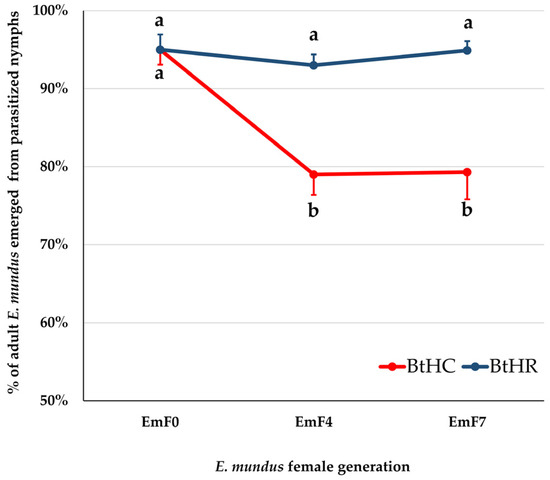 The GLM model showed a significant effect of host strain (Wald χ2 = 8.82, d.f. = 1, p < 0.001), parasitoid generation (Wald χ2 = 10.87, d.f. = 2, p = 0.004), and their interaction (Wald χ2 = 10.07, d.f. = 2, p = 0.006) on the number of nymphs parasitized by E. mundus. A multiple comparison analysis showed that BtHC nymphs were significantly less parasitized than BtHR nymphs when exposed to EmF4 (p = 0.0005) and EmF7 (p = 0.009) females, while no difference between the two strains emerged when parasitization was made by EmF0 females (Figure 3). Furthermore, the number of parasitized nymphs of the BtHR strain did not differ significantly among the three generations of E. mundus. Conversely, when E. mundus was allowed to oviposit on the BtHC strain, the number of nymphs parasitized by EmF0 was significantly higher than the number of nymphs parasitized by EmF4 (p = 0.007) or EmF7 (p = 0.001).