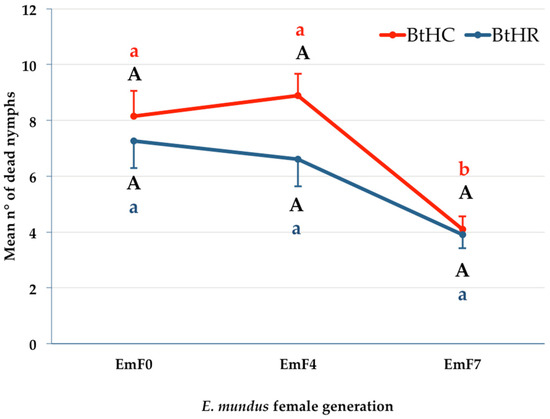 The GLM model revealed that there was no statistically significant interaction effect of host strain and parasitoid generation on the number of dead nymphs (Wald χ2 = 1.88, d.f. = 2, p = 0.39). However, while the host strain had no effect on the number of dead nymphs (Wald χ2 = 2.47, d.f. = 1, p = 0.12), there were significant differences between the E. mundus generations (Wald χ2 = 32.64, d.f. = 2, p < 0.001). Multiple comparison analysis showed that for the BtHR strain, there were no significant differences in the number of dead nymphs between the three generations of E. mundus. For the BtHC strain, the number of dead nymphs observed in arenas treated with EmF7 females was significantly lower than that observed for EmF0 (p = 0.02) and EmF4 (p = 0.0004) females (Figure 5).