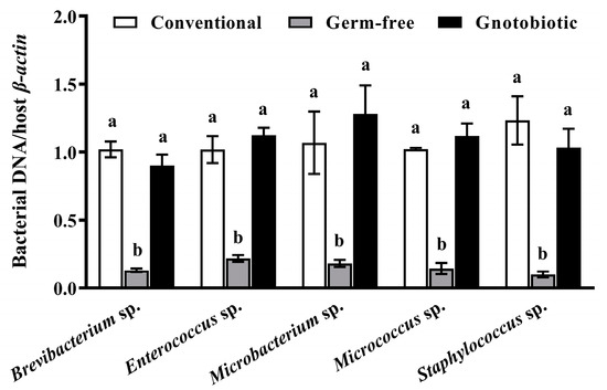 Mean ± SE relative gut load of Brevibacterium sp., Enterococcus sp., Microbacterium sp., Micrococcus sp., and Staphylococcus sp. in adult Tribolium castaneum with different treatments of gut bacteria (n = 5). Germ-free means that gut bacteria are successfully depleted from beetles via antibiotic treatment. Gnotobiotic means that a given gut bacterium is successfully inoculated into germ-free beetles. The same letters indicate no significant difference among the means in the same cluster (one-way ANOVA and Tukey HSD test, p > 0.05).