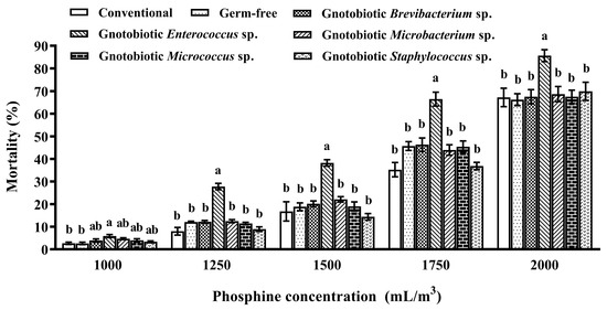 Mean ± SE mortality of adult Tribolium castaneum after exposure to different concentrations of phosphine for 20 h (n = 5). Germ-free means that gut bacteria are successfully depleted from beetles via antibiotic treatment. Gnotobiotic means that a given gut bacterium is successfully inoculated into germ-free beetles. The same letters indicate no significant difference among the means in the same cluster (one-way ANOVA and Tukey HSD test, p > 0.05).