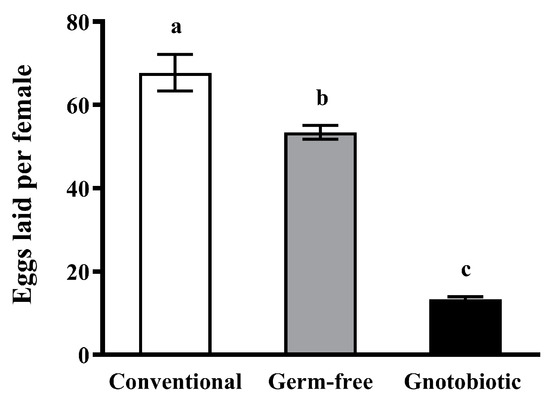 Female fecundity of conventional, germ-free, and gnotobiotic beetles was measured to assess the impact of Enterococcus sp. inoculation on reproductive fitness of T. castaneum after exposure to phosphine. After exposure of 20 pairs of 10-day-old beetles to 1250 mL/m3 phosphine for 20 h, the beetles were ventilated and then cultured under normal conditions. Pairs were separately cultured with a normal diet in a culture plate with a diameter of 15 mm and checked daily for 45 d, on which most females did not lay eggs anymore. The diet was changed every 2 d. Freshly laid eggs were transferred to a new culture plate and monitored for 10 d for emergence. Female fecundity was defined as the number of viable eggs laid per female. The average fecundity of 20 pairs represented one biological repetition. Each treatment consisted of five biological repetitions.