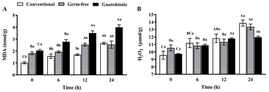 After exposure to 1250 mL/m3 phosphine for 0, 6, 12, and 24 h, the level of MDA and H2O2 in T. castaneum was measured to assess the impact of phosphine exposure and Enterococcus sp. inoculation on host oxidative stress. Phosphine exposure induced serious oxidative stress in T. castaneum, and the MDA level (Figure 4A) in conventional, germ-free, and gnotobiotic beetles increased as the phosphine exposure period was extended (F3,16 = 33.78, p < 0.001; F3,16 = 4.64, p = 0.016; F3,16 = 24.30, p < 0.001, respectively). Enterococcus sp. inoculation further promoted oxidative stress, and the MDA level in gnotobiotic beetles was substantially higher than that in germ-free beetles after exposure to phosphine for 6, 12, and 24 h (F2,12 = 15.67, p < 0.001; F2,12 = 45.98, p < 0.001; F2,12 = 13.44, p = 0.001, respectively).