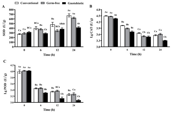 Mean ± SE activity of superoxide dismutase (SOD, A), catalase (CAT, B), and peroxidase (POD, C) in adult Tribolium castaneum after exposure to 1250 mL/m3 phosphine for different periods (n = 5). Germ-free means that Enterococcus sp. is successfully depleted from beetles via antibiotic treatment. Gnotobiotic means that Enterococcus sp. is successfully inoculated into germ-free beetles. The same uppercase letters indicate no significant difference among the means with the same treatment of gut bacteria across different exposure periods, and the same lowercase letters indicate no significant difference among the means of conventional, germ-free, and gnotobiotic beetles within the same exposure period (one-way ANOVA and Tukey HSD test, p > 0.05).