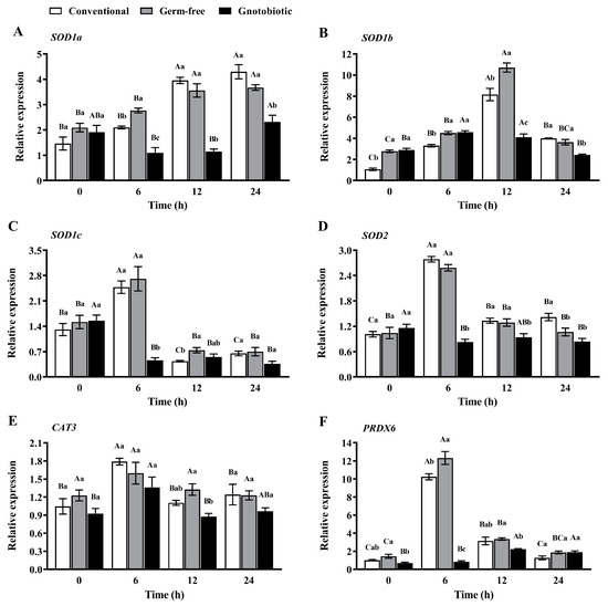 The expression levels of SOD1a, SOD1b, SOD1c (three transcript variants of the SOD1 gene in T. castaneum), SOD2, CAT3, and PRDX6 in T. castaneum were measured after exposure to 1250 mL/m3 phosphine for 0, 6, 12, and 24 h (Figure 6). Phosphine exposure led to upregulation of SOD gene expression. The expression levels of SOD1a, SOD1b, SOD1c, and SOD2 first increased and then decreased in conventional, germ-free, and gnotobiotic beetles as the phosphine exposure period was extended (F3,16 = 47.88, p < 0.001; F3,16 = 18.37, p < 0.001; F3,16 = 7.12, p = 0.003 for SOD1a, respectively; F3,16 = 94.45, p < 0.001; F3,16 = 179.90, p < 0.001; F3,16 = 29.06, p < 0.001 for SOD1b, respectively; F3,16 = 54.07, p < 0.001; F3,16 = 21.35, p < 0.001; F3,16 = 29.63, p < 0.001 for SOD1c, respectively; F3,16 = 123.62, p < 0.001; F3,16 = 54.13, p < 0.001; F3,16 = 3.92, p = 0.028 for SOD2, respectively), reaching the maximal values after exposure to phosphine for 24, 12, 6, and 6 h, respectively.