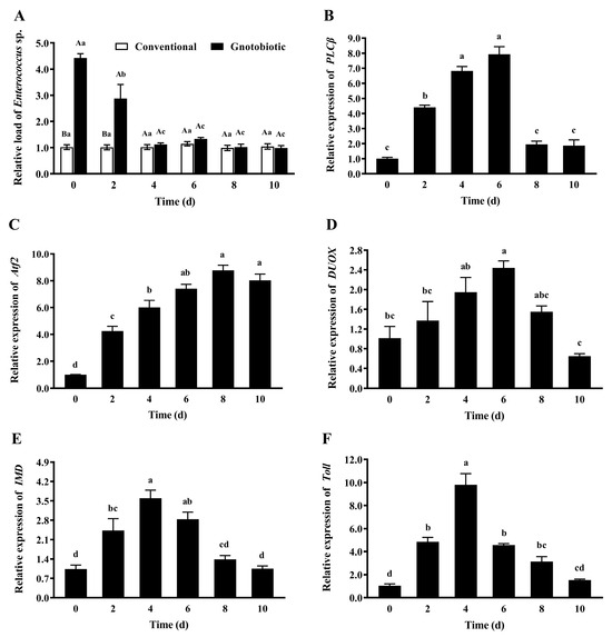 To assess the impact of Enterococcus sp. inoculation on host immune responses, the gut load of Enterococcus sp. and the expression levels of PLCβ, Atf2, DUOX, IMD, and Toll in gnotobiotic T. castaneum were evaluated on days 0, 2, 4, 6, 8, and 10 after inoculation of Enterococcus sp. to germ-free beetles. After Enterococcus sp. was inoculated into germ-free beetles, the gut load of Enterococcus sp. in gnotobiotic beetles (Figure 7A) was significantly higher than that in conventional beetles during the first two days after bacteria inoculation (F1,8 = 313.73, p < 0.001; F1,8 = 11.77, p = 0.009) and recovered to the normal level from the fourth day after bacteria inoculation (F1,8 = 0.89, p = 0.374 for the fourth day; F1,8 = 3.40, p = 0.103 for the sixth day; F1,8 = 0.06, p = 0.808 for the eighth day; F1,8 = 0.19, p = 0.674 for the tenth day).