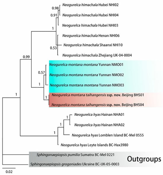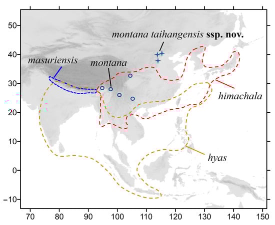 The first clade comprises N. himachala collected from different localities. The second clade comprises the reciprocally monophyletic N. montana montana and N. montana taihangensis ssp. nov. and N. himachala and N. montana are sister species. Sister to these two taxa is a clade comprising N. hyas from Lomblen Island (Indonesia), Leyte Island (Philippines), and Hainan Island (China) (Figure 2).