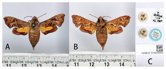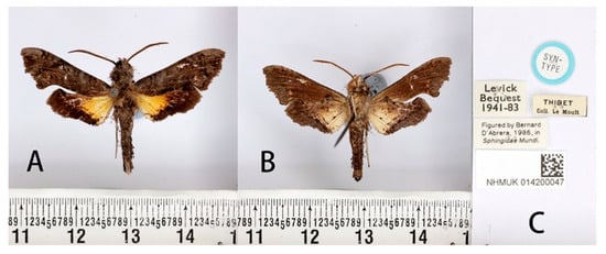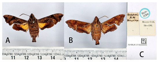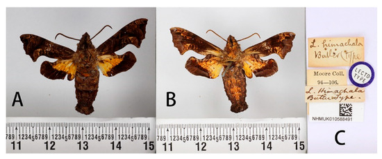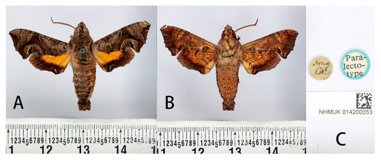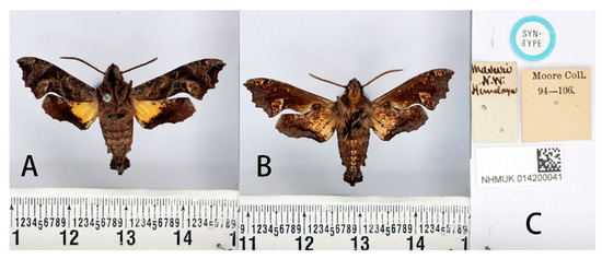 Lectotype of Neogurelca himachala (Butler, 1876), India, male. Photo by A. Giusti, NHMUK. (A) Upperside; (B) underside; (C) labels. All images © The Trustees of the Natural History Museum, London, UK.