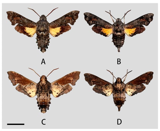 Photos of Neogurelca montana montana. (A,C) Male, Shangri-La Alpine Botanical Garden, Diqing, Yunnan, China; (B,D) female, Cang Shan, Dali, Yunnan, China. Scale bar = 10 mm.