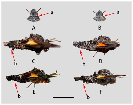 Morphological comparison of Neogurelca montana montana, N. montana taihangensis Xu & He ssp. Nov. and N. himachala. (A) Head of N. montana montana; (B) head of N. montana taihangensis Xu and He ssp. Nov.; (C) lateral view of male N. montana montana; (D) lateral view of male N. montana taihangensis Xu and He ssp. Nov.; (E) lateral view of male N. himachala; (F) lateral view of female N. montana taihangensis Xu and He ssp. nov.; a—patagia; b—lateral hair tufts in abdomen. Scale bar = 10 mm.