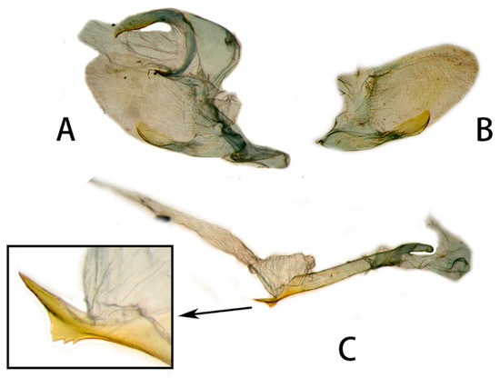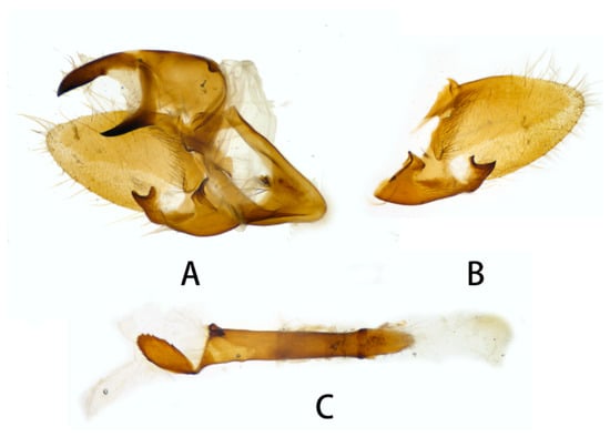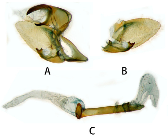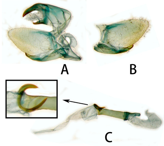 Male genitalia of Neogurelca montana montana, Yunnan, China. (A) Lateral view; (B) right valve; (C) phallus. © The Trustees of the Natural History Museum, London, UK. https://sphingidae.myspecies.info/taxonomy/term/1965/media (accessed on 11 October 2023).
