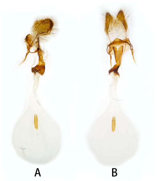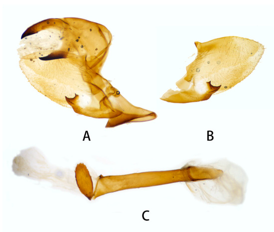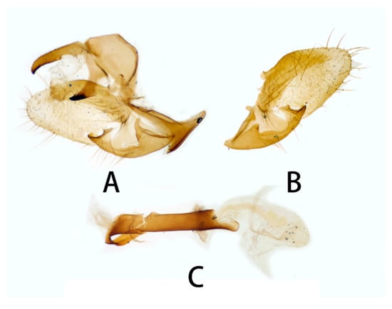 The male and female genitalia were prepared following Hu et al. [35]. Forewing lengths were measured to 0.5 mm precision using a ruler. The whole abdomen was removed and placed into a 1.5 mL microcentrifuge tube, treated with 1 mL 10% sodium hydroxide solution to digest soft tissue for 1 h at 70 °C. The treated abdomen was then neutralized with 2% acetic acid and dissected in a water-filled Petri dish under a stereomicroscope to remove residual tissues, scales, and hair. The genitalia were transferred to 80% glycerol for 12 h to render them transparent. Photographs of the genital structures were taken with a KUY NICE E3ISPM (KUY NICE, Beijing, China) and automatically stacked using Helicon Focus 7.5.4 (Helicon Software, Kharkiv, Ukraine). After examination and photographing, all parts of the genitalia were fixed onto a card with water-soluble white glue and pinned with the specimen.