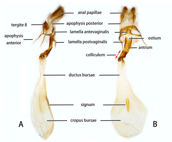 Nomenclature of female genitalia of Neogurelca montana montana, Dali, Yunnan, China. (A) Lateral view; (B) ventral view.