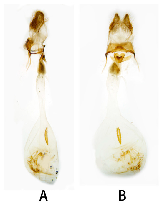Female genitalia of Neogurelca montana taihangensis Xu & He ssp. nov., Haidian, Beijing, China. (A) Lateral view; (B) ventral view.
