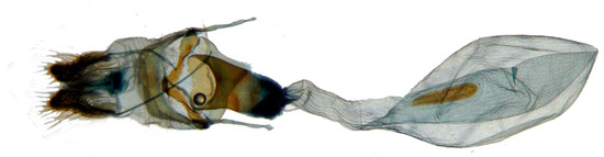 Female genitalia (Figure 8). Anal papillae short, consisting of two ridge-shaped lobes with long setae; posterior apophysis slender, arising from the tergite 10 laterally and reaching ostium bursae; lamella antevaginalis ridge-shaped medially, with the anterior apophyses arising on each side; lamella postvaginalis composed of two slightly sclerotized and separated lobes; ostium bursae heavily sclerotized, inverted triangle-shaped; antrum long and broad, extended by a quite heavily sclerotized and twisted colliculum; ductus bursae long and gradually broadening into a rounded corpus bursae; signum well defined by sclerotized granules.