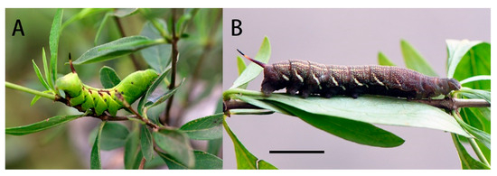 Three final instar larvae were collected, one each from the lower mountain area of Huangshandian village, the Beijing Shangfangshan National Forest Park (Fangshan District, Beijing, China), and the China National Botanical Garden after observing larvae on the food plants (Leptodermis oblonga Bunge) in the field. Tender shoots bearing larvae were clipped from the food plants and placed individually into plastic boxes lined with moist tissue on site. Branches of the food plant with healthy leaves were also collected and sealed in plastic bags and preserved at 4 °C for future use.