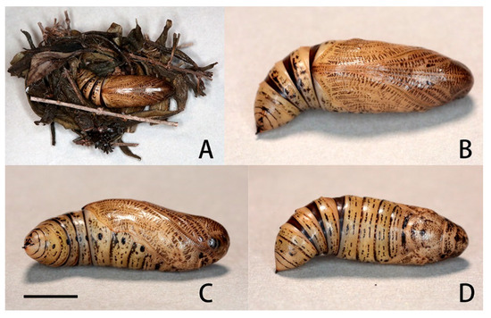 Pupa (Figure 28C,D): Body length 23–25 mm; breadth 8 mm. Similar to N. montana, but ochreous in colour. The regular interrupted transverse bars on head, tongue, wing-case, legs, antenna and thorax of leaden colour, less developed than those of N. montana.
