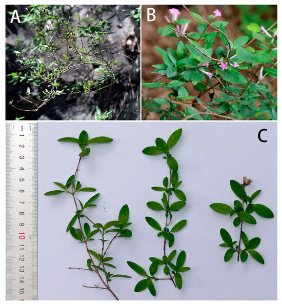 Leptodermis oblonga, Host plant of Neogurelca montana taihangensis Xu & He ssp. nov. in Beijing, China. (A) The shrub of Leptodermis oblonga, photo by Jia-Xuan Wang.; (B) tender branches, leaves, and flowers in the field; (C) tender branches and leaves with scale bar, photo by Yu-Chen Zhang.