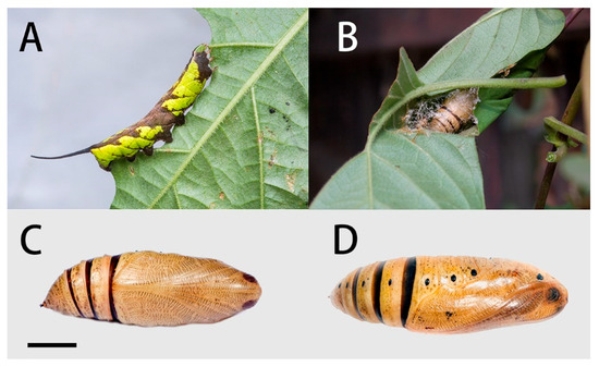 Life stages of Neogurelca himachala. (A) Final instar larva; (B) pupa in pupal chamber spun among leaves of host plant; (C) ventral view of pupa, scale bar = 10 mm.; (D) lateral view of pupa. All images by Ji-Bai He.