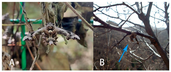 Live adults of Neogurelca montana taihangensis ssp. nov. and habitat. (A) A female adult on a dead leaf, photo by Nan Yang; (B) adult (blue arrow) on a branch in early spring in Beijing, photo by Nan Yang.