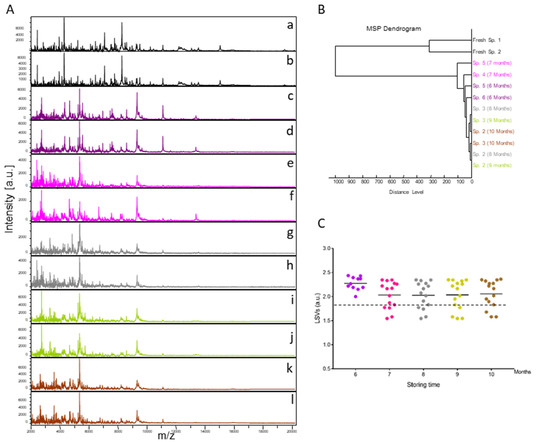 Consequences on cephalothorax MS spectra for their identification of storing fleas in alcohol. (A) Representative MS spectra of cephalothoraxes of fresh adult C. felis (a, b) and adult C. felis stored for 6 (c, d), 7 (e, f), 8 (g, h), 9 (i, j), or 10 (k, l) months in alcohol 70% v/v. (B) Reproducibility and specificity of MALDI-TOF MS spectra from C. felis fleas. Two specimens per storage method (fresh vs. alcohol) and duration (from 6 to 10 months in alcohol) were used to construct the MSP dendrogram. The dendrogram was created using Biotyper v3.0 software (Bruker Daltonics, Germany), and distance units correspond to the relative similarity of MS spectra. (C) Comparison of LSVs obtained for 15 specimens stored in alcohol tested monthly against the upgraded homemade MS reference database with MS spectra from C. felis stored in alcohol. At month 6, as four were included in the DB, only 11 MS spectra were queried against the DB. Dashed lines represent the threshold value for reliable identification (LSV > 1.8). The same color code was used between the different panels for specimens stored in the same conditions. a.u., arbitrary units; LSVs, log score values; m/z, mass-to-charge ratio.