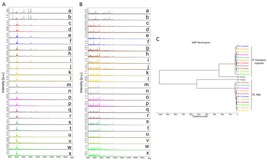 Protein mass profiles were generated using a Microflex LT MALDITOF Mass Spectrometer (Bruker Daltonics, Germany). Details regarding MALDI-TOF MS parameters and MS spectra analysis were identical to previous studies [20,26,40]. Briefly, the reproducibility of the MS spectra was compared visually using four spectra of each sample tested using flexAnalysis v3.3 and ClinPro Tools v2.2 software (Bruker Daltonics). Two representative spectra of each time point were chosen based on the peak position, intensity, and frequency data for each species. The same samples were used for clustering analysis using MALDI-Biotyper v.3.0 software (Bruker Daltonics, Germany). Cluster analyses (MSP dendrogram) were performed to determine how the organisms relate to each other. A fresh specimen of lice and fleas was included in the dendrogram.