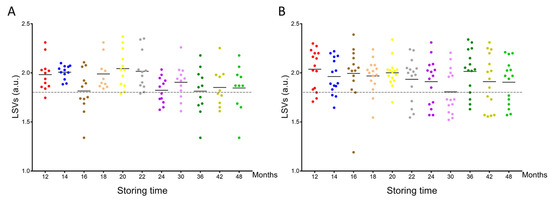 Comparison of LSVs obtained for louse and flea specimens stored in alcohol and kinetically subjected to MS analysis against the upgraded homemade MS reference database. LSVs obtained for cephalothorax MS spectra from P. humanus corporis (A) and C. felis fleas (B) stored in alcohol for between 12 months and 48 months were presented. The dashed line represents the threshold value for reliable identification (LSV > 1.8). The same color code was used between the different panels for specimens stored in alcohol for the same length of time. a.u., arbitrary units; LSV, log score value.