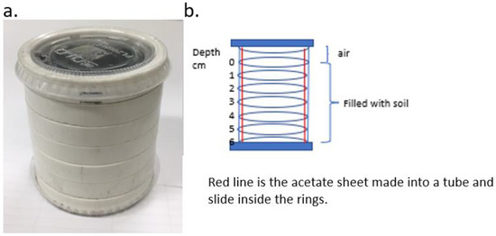 A stacked ring system [14,24] was developed and consisted of 7 stacked rings made of PVC tubing (5.25 mm ID, 6 mm outer diam and 1 cm thick) (Figure 1a). The bottom ring was placed in a plastic lid (Solo PL2, Lake Forest, IL, USA) that fit snugly, and 6 rings were stacked on top. A liner made of an acetate sheet (20 cm × 6.5 mm tall) was formed into a cylinder and placed inside the rings and served to hold and stabilize the ring stack (Figure 1b). A substrate was added to each ring to the top of the 6th ring, and a lid was added to the top of the 7th ring, which provided 1 cm of air space. All substrates were used at similarly low levels of compaction.