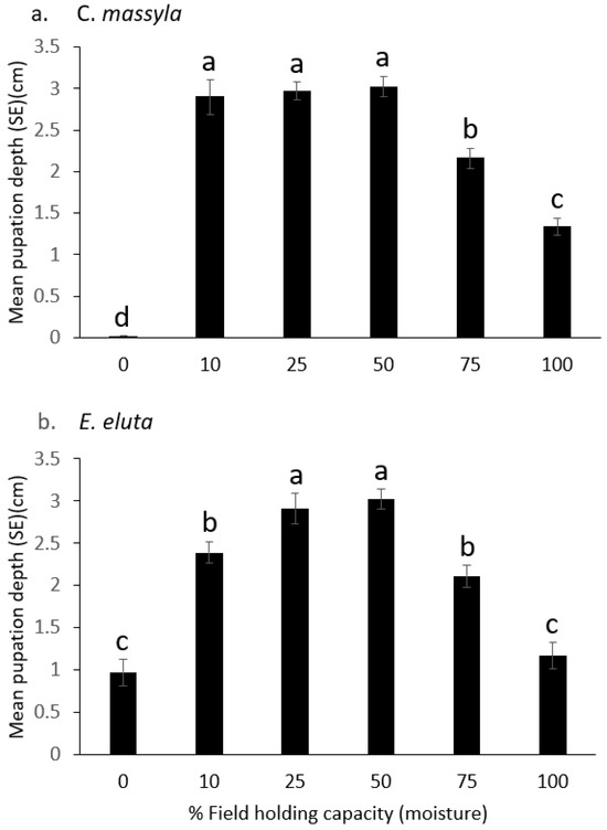 Comparison of the depth of pupation (cm below surface) at six levels of field holding capacity (moisture) of (a) Chaetopsis massyla and (b) Euxesta eluta. 0 depth indicates soil surface. Within each species, means with different letters are significantly different (p < 0.05).