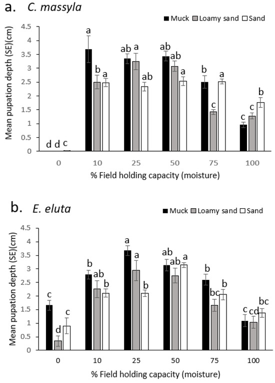 Comparison of the depth of pupation (cm below surface) of (a) Chaetopsis massyla and (b) Euxesta eluta in three soils at six levels of field holding capacity (moisture), with 0 depth indicating the soil surface. Within each soil type, means with different letters are significantly different (p < 0.05).