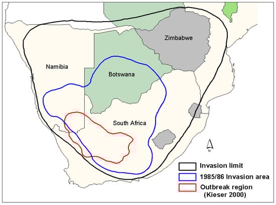 The names of the provinces of South Africa, as well as many of the magisterial districts and town names referred to in the text where outbreaks were historically reported, have since changed under the new political dispensation since 1994. The previous provincial names are recited in the current text to maintain continuity with place names given in the historical literature, but the corresponding modern names of the provinces are given herewith, viz. Cape Colony (the Western Province, Northern Cape Province, and parts of the Eastern Province), Northern Cape (Northern Cape Province), Natal (KwaZulu Natal Province), Orange Free State (Free State Province), western Transvaal (North West Province), northern Transvaal (Limpopo Province), and eastern Transvaal (Mpumalanga Province). The previous names of magisterial districts and towns are mostly retained in the text to aid reference to the literature.