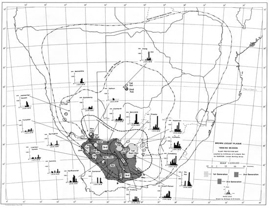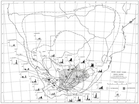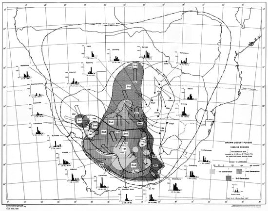 The 1985/86 outbreak, as depicted in Figure 2, started in the central Karoo districts in October 1985, following widespread drought-breaking rains across the Karoo. Uncontrolled swarms escaped and mainly flew north and northwest in December 1985. A widespread second generation developed, and large numbers of swarms migrated north and northwest in February and March 1986 into Botswana and southern Namibia (Figure 2). Later in April and May, swarms flew southeast into the Eastern Cape Province. However, the swarms that had migrated deep into the Kalahari in Botswana in February and March 1986 were able to successfully breed under the warmer early winter conditions found at these latitudes and altitudes, unlike in the Karoo, where winter temperatures are a lot lower and prevent further breeding. The extensive breeding in the Kalahari Desert resulted in numerous very large swarms that migrated back into South Africa between late May and September 1986 on the prevailing winter winds (Figure 3). Many of these flying swarms were controlled by spray aircraft in Botswana, but others migrated into South Africa, where they were controlled in the North West and Free State Provinces. But, some managed to migrate all the way back to the prime breeding areas in the Karoo (Figure 3). This migration pattern possibly gave a glimpse of the historical uncontrolled plague migration patterns of the brown locust within southern Africa that occurred in the days before chemical control intervention at the turn of the twentieth century, with swarms vacating the Karoo and exiting South Africa only for some of their future progeny to reinvade the Karoo in a return migration later during the plague cycle. A total of >175,000 brown locust hopper bands and approximately 40,000 adult swarms were controlled during the 1985/86 campaign [4].