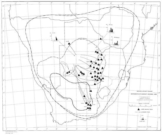 Lounsbury [2] and Lea [18] described reports of red locust infestations in South Africa from 1840 to 1853 and then again from about 1888 to 1907, while the third plague invasion between 1933 and 1944 is described in great detail [18,43,44]. Apart from these three recognized plague invasions, Lounsbury [2] also reports earlier accounts of locusts ravaging the gardens of the Dutch settlers in the Cape Town colony in 1653, in 1687, and again in December 1746. It is probable that these invasions were also of the red locust as records state that the locusts ate the leaves of the trees, which is not typical feeding behavior of the indigenous brown locust (Price, pers. obs.). In addition, Lounsbury [2] states that even in brown locust plague years, the brown locust swarms did not reach the Atlantic coast of the Union of South Africa.