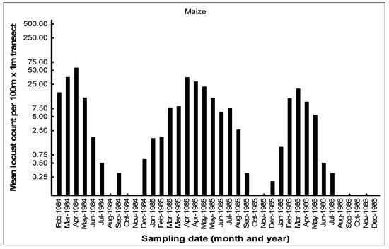 The seasonal patterns of the build-up of AML populations in the various habitats in the cereal crop environment on the Highveld were demonstrated by closely monitoring population numbers. Monthly flush counts of adult AML were undertaken in 1984–1986 along 100 m transects walked in maize, grass headlands, and wheat fields at a series of farms with a history of previous AML outbreaks in the Free State and North West Provinces. The number of adult locusts flushed up immediately in front of the walker over a 1 m width were counted using hand-held tally counters along the 100 m transects walked at random in the seasonal maize and wheat crops. The counts along the narrow grass headlands were undertaken using the same path each time. Counts were only undertaken when it was warm enough for the locusts to fly up from the ground. A total of 10 transects were undertaken in each habitat at each visit, and the mean flush counts were recorded (Price, unpublished data). An example of a data set of flush counts for seasonal maize and wheat crops and along the permanent grass headlands is shown for the farm Kromvlei (27°27′ S, 26°45′ E) in the Bothaville district of the Free State Province between February 1984 and December 1986 (Figure 7, Figure 8 and Figure 9). The mean flush counts of AML adults are shown on a logarithmic scale as counts along the grass headlands reached >500 per 100 m transect at peak outbreak season. During the peak season months of March–April, additional visits were sometimes made to the farm to undertake an additional AML count in maize and grass headland habitats.
