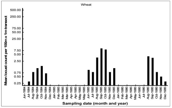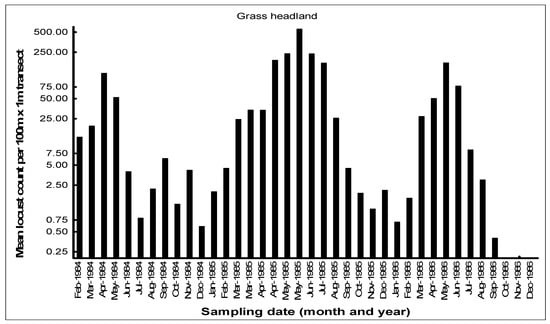 AML population numbers in maize fields on the farm Kromvlei rose rapidly in late summer and autumn, reaching a peak in April of each year (Figure 7). Maximum densities in maize were 0.3–0.5 AML per m2. Locusts flew spontaneously during the day, but there was little evidence of any dispersal at night, with locusts found static in the maize fields even on relatively warm nights, and only the very occasional AML was found at street lights in local towns during peak summer. The maize crop was usually harvested in June, and population numbers then dropped dramatically. Populations along the grass headlands peaked between March and June as locusts made a daily move from their roosts in the drying maize crop to congregate during the day along the open grass habitat to bask and feed (Figure 8). Peak densities of 5–10 locusts/m2 were recorded on some occasions. The grass headlands were also where hoppers tended to aggregate and where phase transformation took place. Although scattered hopper bands were common, the E/F ratios of adult locusts collected during peak populations in 1985 measured 1.87 and 1.84 for males and females, respectively (n = 30 of each sex), which were considered typical for the solitarious phase, as given by Lean [25]. The wheat habitat was seasonal, available from May to December each year, and AML adults first colonized the young wheat crop in June–July. Populations bred in the wheat between August and September, but adult numbers were always relatively low (Figure 9). Hopper populations were recorded between September and November, but fledglings rapidly left the crop when it was harvested in December.