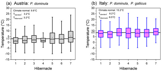 In both study habitats, hibernacle temperatures varied between locations. Nevertheless, the mean hibernacle temperatures revealed a significant difference in the hibernacle microclimate between the habitats in Austria and Italy during the overwintering period (Thibernacle, December–March 2017–2020; p = 0.0022, Mann–Whitney test). The mean ambient air temperature (±SD) in the seven P. dominula hibernacles in Austria was 3.2 ± 5.71 °C. In the seven mixed hibernacles of P. dominula and P. gallicus in Italy, we measured 8.5 ± 5.29 °C on average (Figure 2).