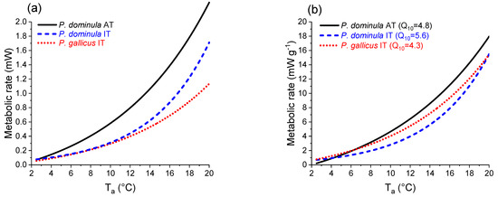 (a) Individual and (b) mass-specific standard metabolic rate of paper wasp gynes from Austria (P. dominula AT) and Italy (P. dominula IT and P. gallicus IT) in relation to ambient air temperature (Ta), modified from Kovac et al. [3]. The Q10 values (quotient of Ta: 7.5 °C to 17.5 °C) of the metabolic functions are indicated; fit functions, parameters, and statistical details are provided in Table S1.