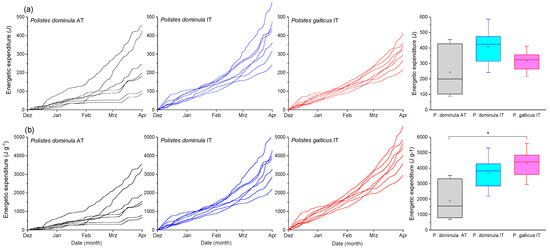 (a) Individual and (b) mass-specific energetic expenditure of paper wasp gynes from Austria (P. dominula AT) and Italy (P. dominula IT and P. gallicus IT) summed up for the overwintering period (December–March 2017–2020). Data were calculated from ambient air temperature in the hibernacles (Thibernacle) and the metabolic rate–temperature model from Kovac et al. [3]. Box and whisker plots represent median temperatures with first and third quartiles; dots in plots are means. Significance: * p < 0.05.