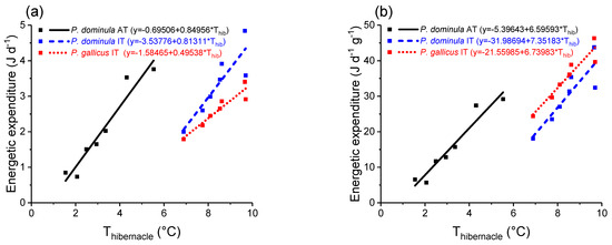 As already mentioned, the metabolic rate increases exponentially with temperature [3] (Figure 3), leading to a disproportionally higher energetic demand during the warm parts of the day. The calculated mean daily costs increase linearly with the hibernacle temperature in all species (Figure 5). The calculation of the daily energetic demand clearly shows that the choice of a certain overwintering site, and thus microclimate, may have a considerable effect on energetic costs. In P. dominula AT, the maximum difference of ~5 °C in the mean hibernacle temperature resulted in a difference in mass-specific energy expenditure by a factor of about 6.5, and in both P. dominula IT and P. gallicus IT, a difference of ~3 °C resulted in a span of energy expenditure by a factor of about 2 (Figure 5b). This strong influence of microclimate on the energetics is similar to summer individuals (workers) of paper wasps: cumulative energy costs during a breeding season are highest in P. gallicus from the warm Mediterranean climate and lowest in P. biglumis from the harsh Alpine climate [32].