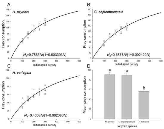 APA StyleWu, P., He, J., Dong, H., & Zhang, R. (2023). Functional Response and Intraspecific Competition of Three Ladybird Species Feeding on Aphids on Goji Berry Plants in Laboratory and Semi-Field Conditions. Insects, 14(11), 853. https://doi.org/10.3390/insects14110853