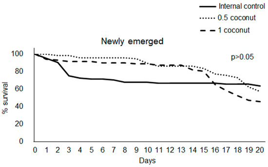 In newly emerged bees, the survival rate significantly decreased in bees fed the internal control diet compared to those fed 0.5% and 1% coconut oil-enriched diets from the third day of feeding (76.5% SD 17.7, 98.5% SD 2.6, 91.5 SD 8.0, for control, 0.5% coconut and 1% coconut diets, respectively; χ2= 23.06, p = 9.83 × 10−6, df = 2). Statistical differences in newly emerged bee survival rates among the three groups were recorded until day 14. On day 15, the survival rate of the internal control was significantly lower than in bees fed a 0.5% coconut oil-enriched diet, while bees fed a 1% coconut oil-enriched diet showed no significant differences to the other two diet groups (68.3% SD 18.8, 82.9% SD 6.9, 80.9 SD 4.5, for control, and 0.5% coconut and 1% coconut diets, respectively; χ2= 6.23, p = 0.044, df = 2). From the 16th to the 18th day and on day 20, no statistical differences in survival rate among the three experimental diet groups were recorded, while on the 19th day, they were significantly higher in the control group than in bees fed 1% coconut oil while no differences were recorded between the 0.5% coconut oil-enriched diet and the other ones (67% SD 18.2, 58.8 SD 31.4, 48.5 SD 18.0, for control, and 0.5% coconut and 1% coconut diets, respectively; χ2 = 6.32, p = 0.042, df = 2).