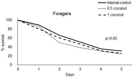 The administration of a coconut oil-enriched diet did not affect glucose oxidase activity in newly emerged and forager bees. This result could indicate a positive effect of coconut oil diet supplementation on bee health since an increase in glucose oxidase activity has been previously associated with a decrease in survival rate [24,25].