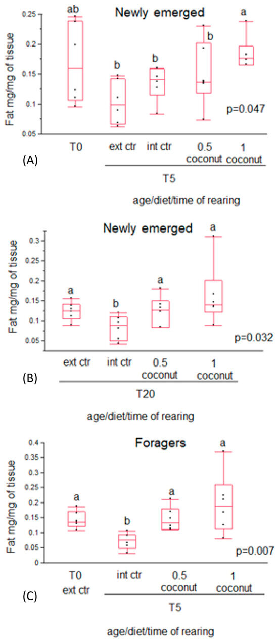 The fat content in newly emerged bees at both T5 and T20 was positively correlated to coconut oil intake, indicating that a higher amount of coconut oil resulted in higher fat accumulation.