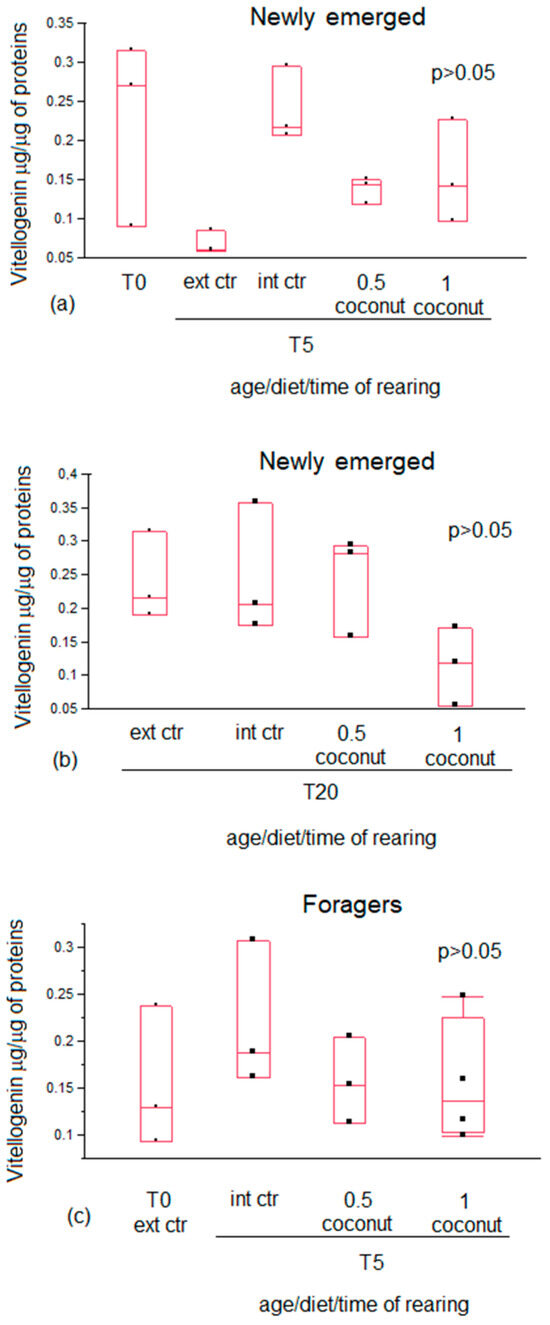 In addition, since vitellogenin content should increase in foraging bees [46], the negative correlation recorded in newly emerged bees at T20 between coconut oil intake and vitellogenin content may indicate a delay in the process of aging.