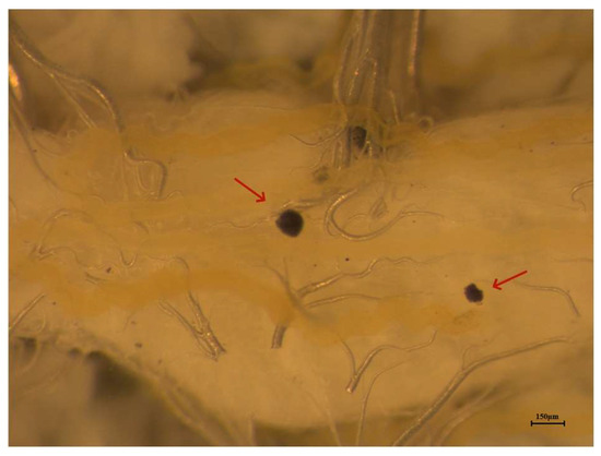 Melanized nodules in infected S. frugiperda larvae injected with bacteria, S. marcescens seen under a Leica dissecting microscope. Red arrows point to the nodules—the dark spots against the lighter internal organs and tissues. Microphotograph by Dr. Lei Zhang.