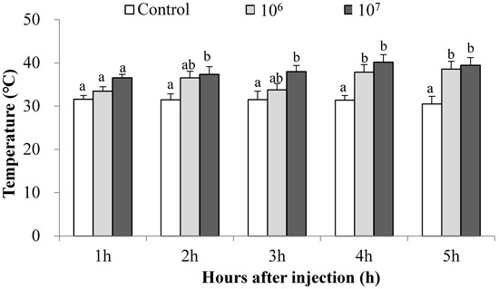 In this experiment, we inoculated separate experimental groups with 106 and 107 bacterial cells/mL in the standard injection volume (1 μL). Control larvae were injected with the same volume of LB. After injection, the larvae were transferred to the 28 °C incubator to recover for 0.5 h post injection (PI), then transferred into a TG to observe their thermal preferenda and record the larval thoracic temperatures during 1, 2, 3, 4 and 5 h after injection.