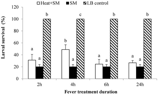 - The influence of imposed fevers (heating) 5 h on nodulation reactions was determined. Control larvae were given the standard SM injection, then immediately transferred into the 28 °C incubator. The heating group of SM-treated larvae were immediately transferred into a 41 °C incubator for 5 h, and IN/larva were counted as described.