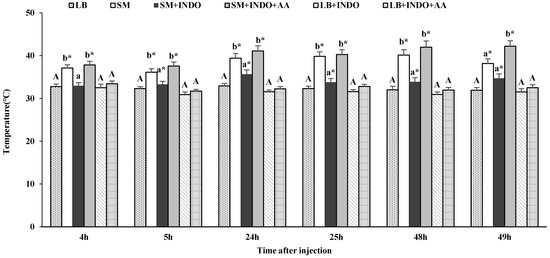The influence of indomethacin (INDO) and arachidonic acid (AA) on the preferred temperature of S. frugiperda in discontinuous behavioral fever treatment. Data are presented as mean ± SEM. Bars sharing the same lower-case letter (a or b) are not significantly different among SM, SM+INDO and SM+INDO+AA treatments at 5% level by Tukey’s HSD test. Bars sharing the capital letter (A) are not significantly different among LB, LB+INDO and LB+INDO+AA control treatments at 5% level by Tukey’s HSD test. Bars sharing the asterisk are significantly different between SM and LB, SM+INDO and LB+INDO, SM+INDO+AA and LB+INDO+AA, respectively, at 5% level by Student’s t-test. Sample size from left to right is 45, 45, 45, 45, 45, 45, 45, 45, 45, 45, 45, 45, 30, 45, 34, 45, 28, 45, 30, 45, 34, 45, 28, 45, 26, 45, 30, 45, 22, 45, 26, 45, 30, 45, 22 and 45, respectively.